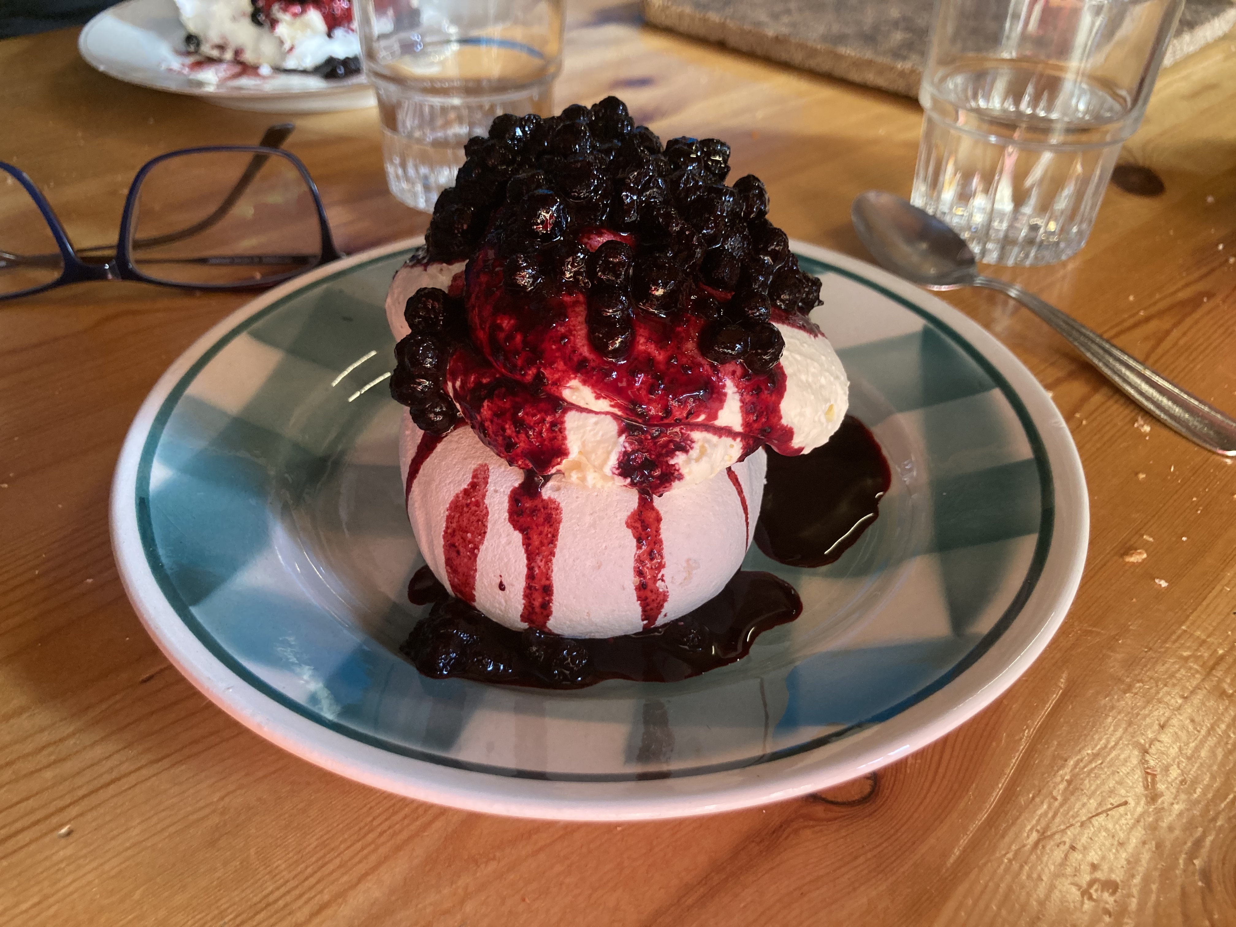 Une pause déjeuner bien sympathique dans ce refuge de montagne au plain mimait des bois Excellente soupe du jour , bien complète avec haricots et saucisse , un plat du jour qui redonne des forces après une demie journée de randonnée excellente pavlova aux myrtilles