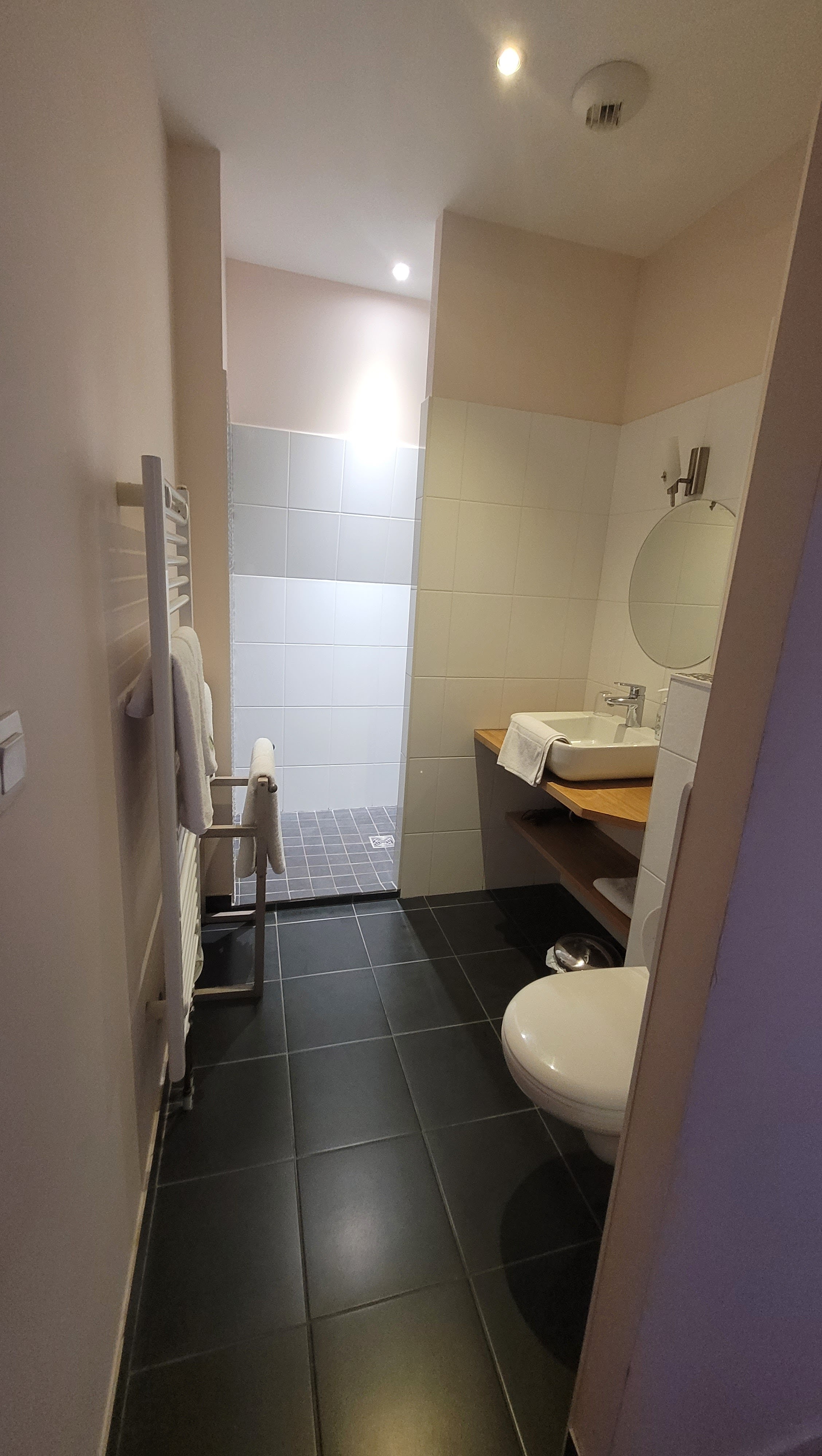 Très bien, belle chambre avec douche et petit dejeuner de qualité