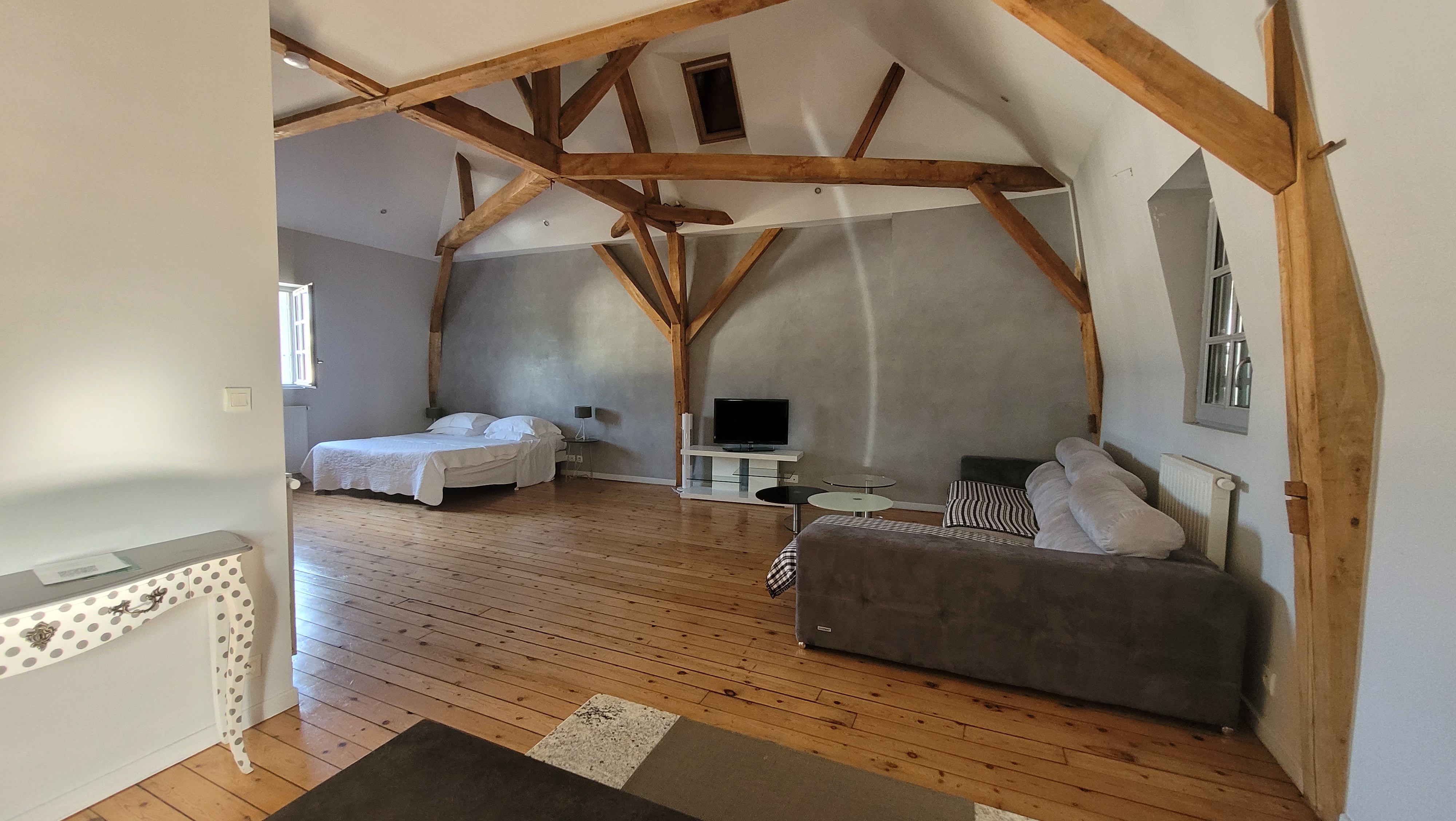jolie chambre, nous avons été surclassé dans un loft. bémol: pas de volets aux velux et pas de porte dans la salle de bains/toilette ! sinon petit déjeuner succulent avec hôte aux petits soins.