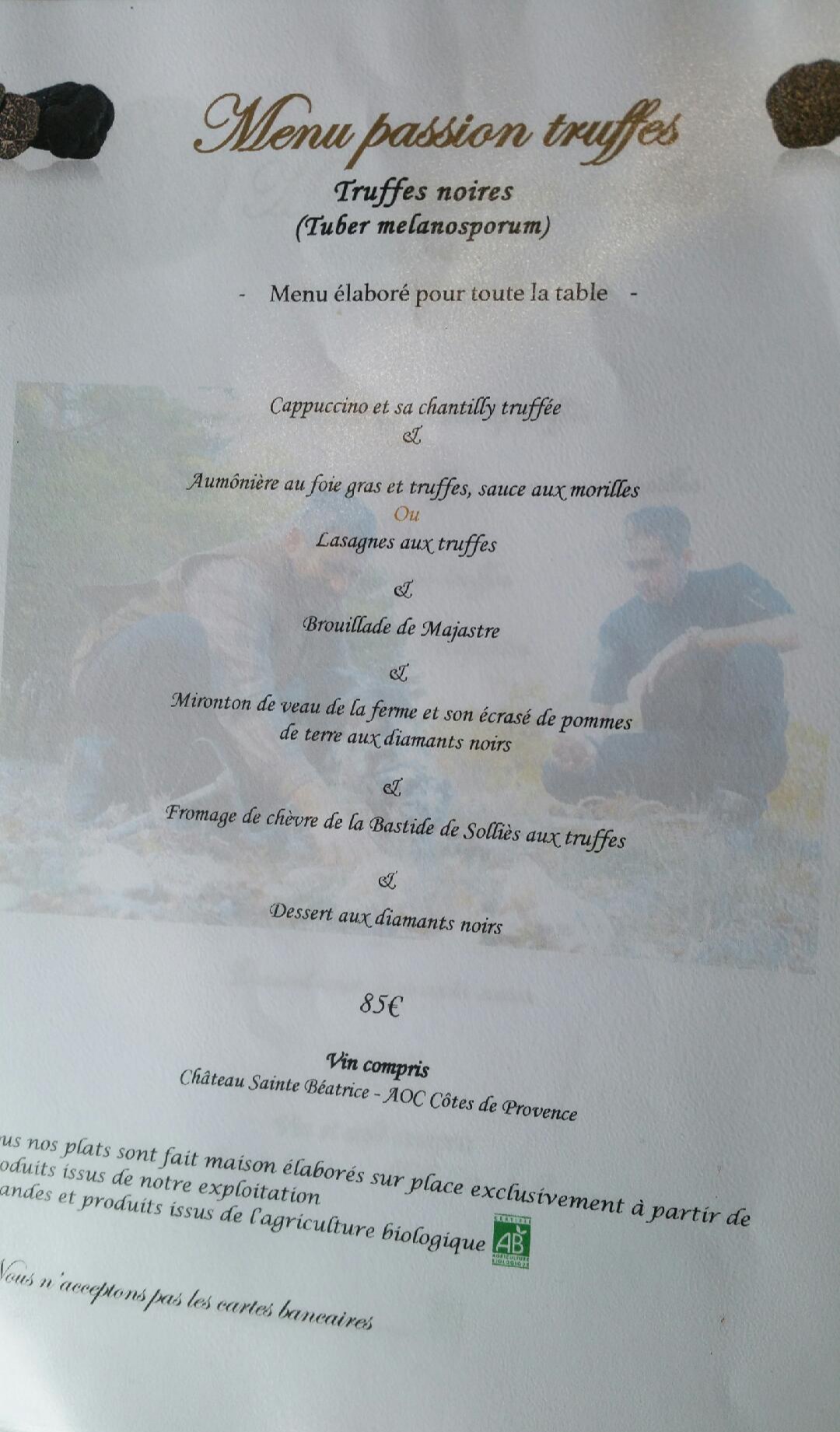 Superbe expérience. Une cuisine exceptionnelle. Un cadre magnifique. Une belle explication sur la recherche des truffes.
