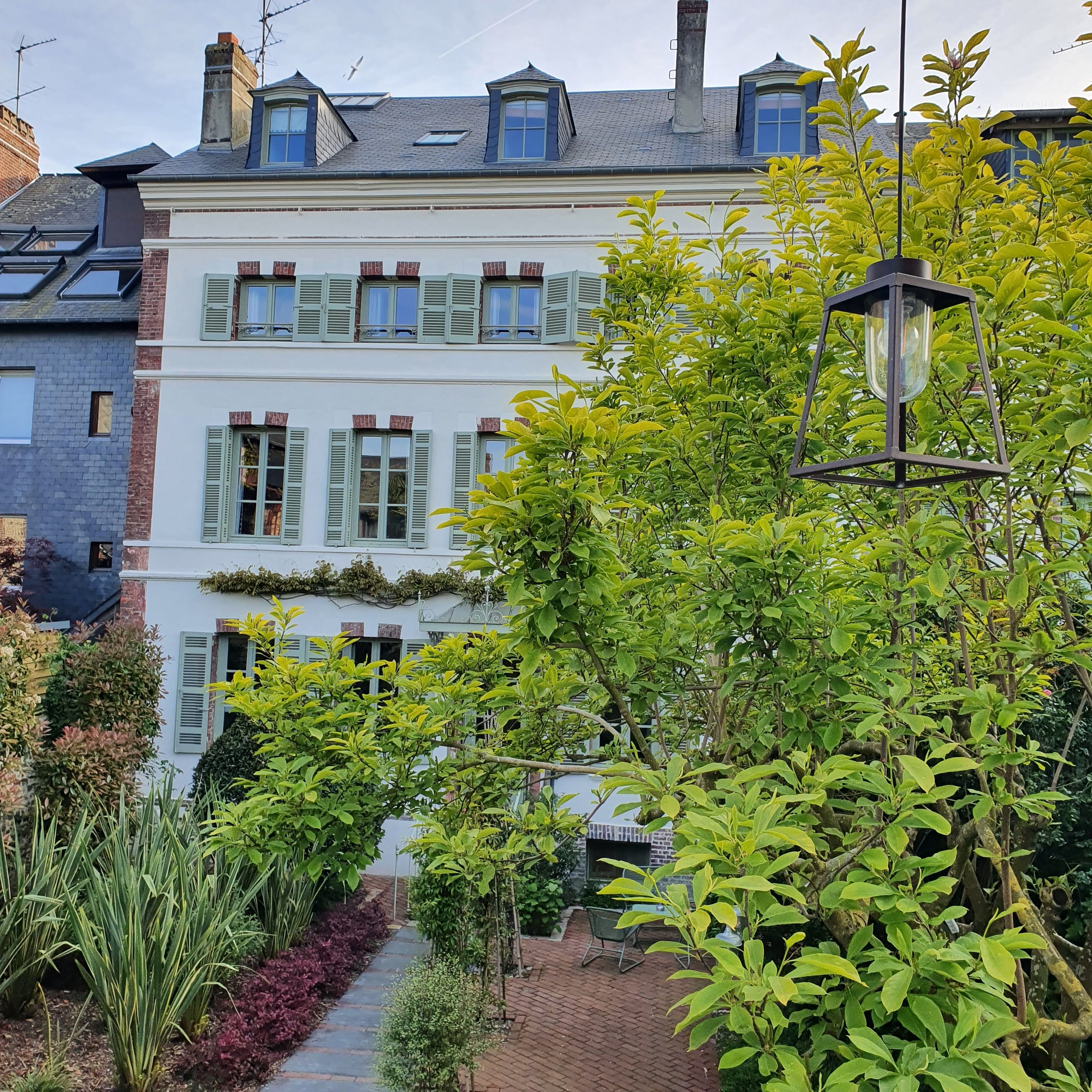 Jolie maison bourgeoise decoré avec beaucoup de goûts. Bien situé dans le centre de Honfleur, pas de parking attenant.(parking gratuit à 5 min à pieds) Personnel sympatique. Chambre parfaite et propre Literie de bonne qualité. Jardin reposant et soigné Endroit charmant. Petit déjeuner pour 12e mais dommage qu ' il ne soit pas plus varié( un fruit, un produit laitier, du fromage, café fait maison ) serait le bienvenu. Adresse à conseiller.