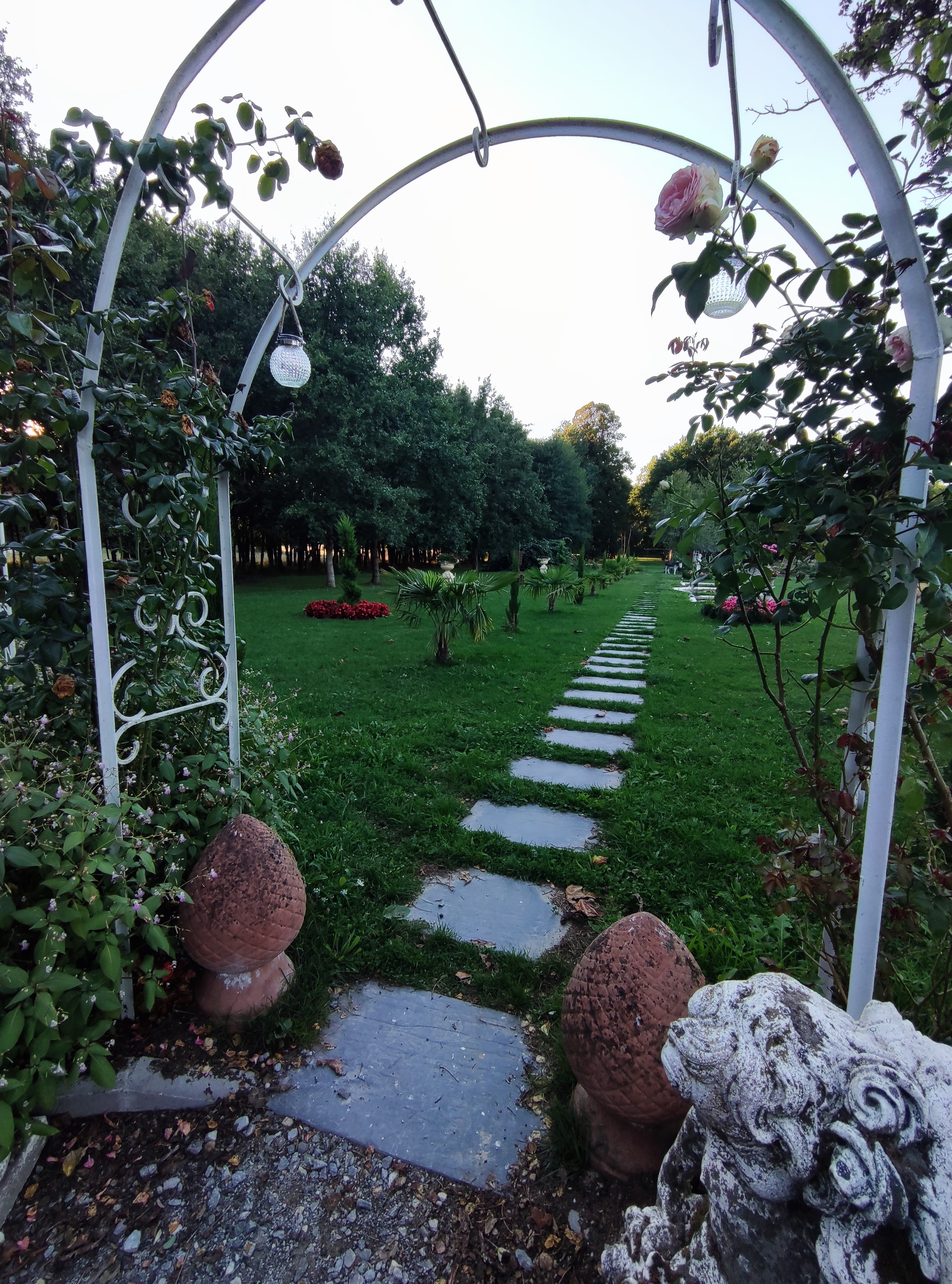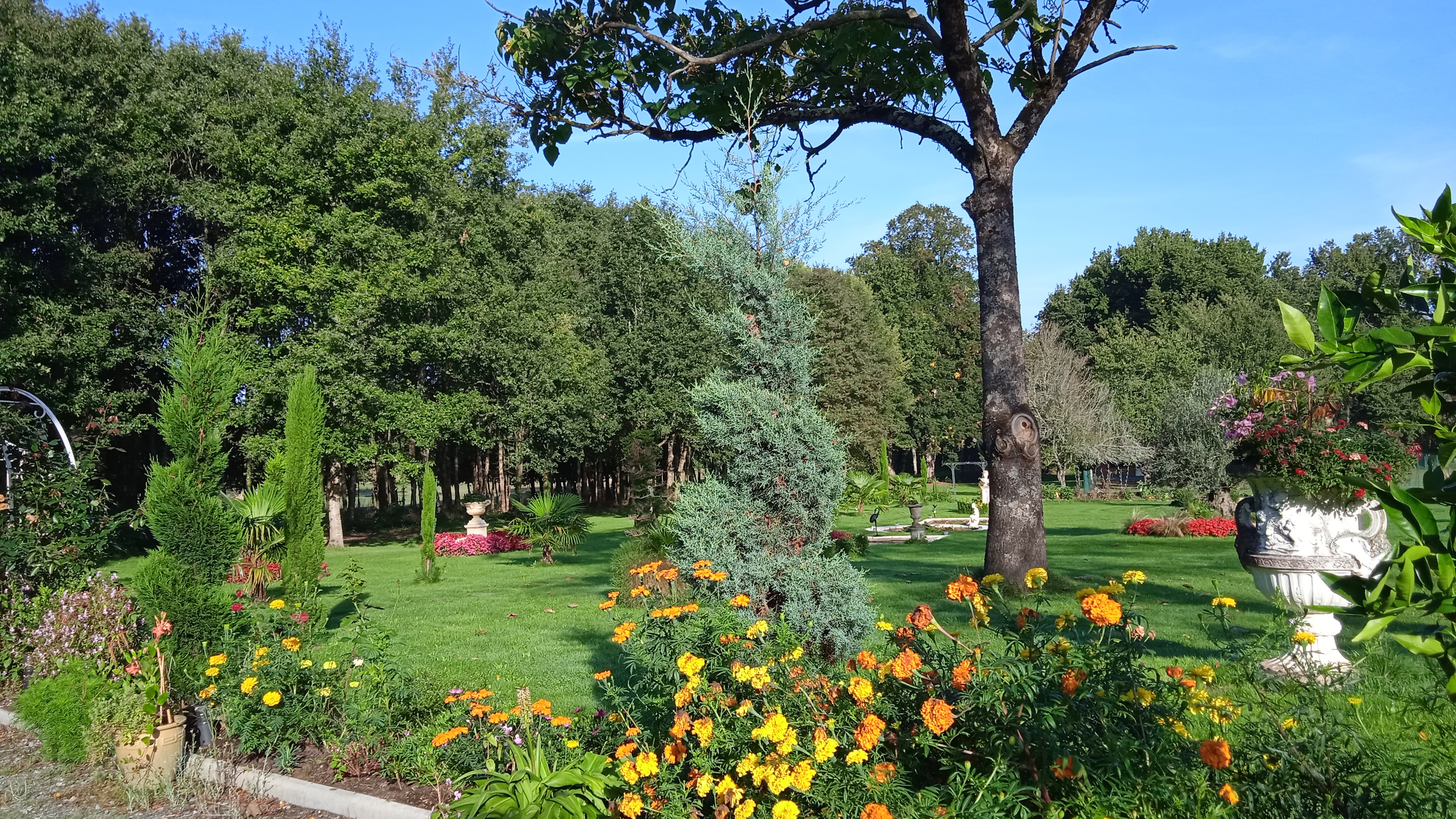 Villa-manoir havre de paix et de nature : multitude d’objets à l’intérieur et jardin splendide devant la villa avec création derrière d’un beau jardin longitudinal bordé de phénix et de bassins d’eau avec koï